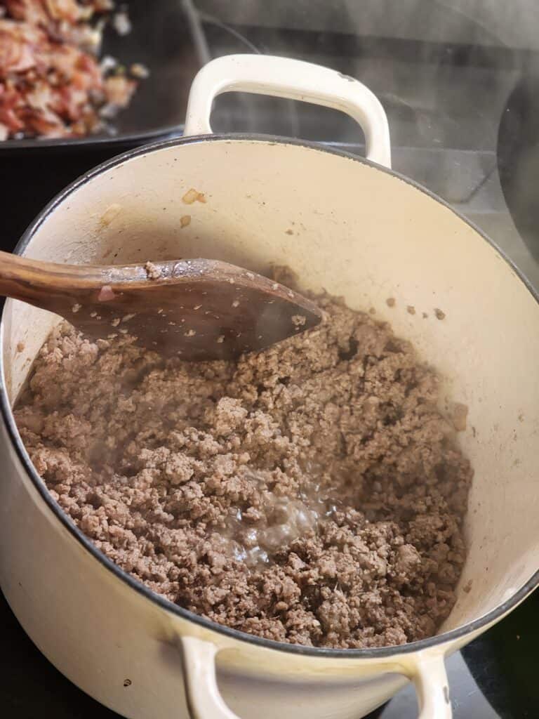 I make most of my soups in my dutch oven, if you don’t have one you’ll just want to sauté the ground beef, bacon and onions in something else and add to your pot of soup later. I sauté the bacon and onion first, I like to do it separately, so the bacon crisps up a bit. Then remove it from the pot and set aside.