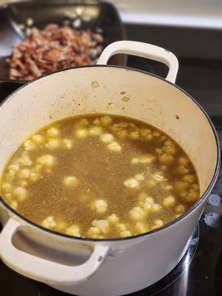 - Add cauliflower, carrots, potatoes and herbs to dutch oven and let them sauté for a few minutes.